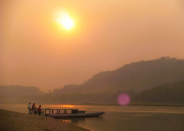 川にボートが浮かび夕日が反射して、ゆったりした時間が流れている感じがします。