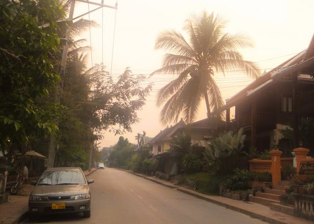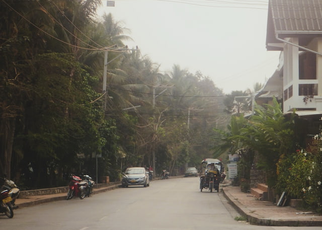 ルアンパバーンのバスターミナルから歩いて街中にあるホテルに向かいします。
