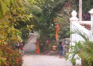 カオピャックのお店の前にあるのがワット・シボヌアン寺院です。オレンジ色の袈裟を着た修行僧が見えました。