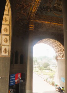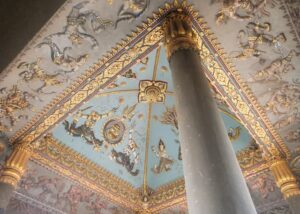パトゥーサイの1階まで降りました。天井をもう一度見上げると、水色の中に金色の彫刻とモザイク画が美しいです。